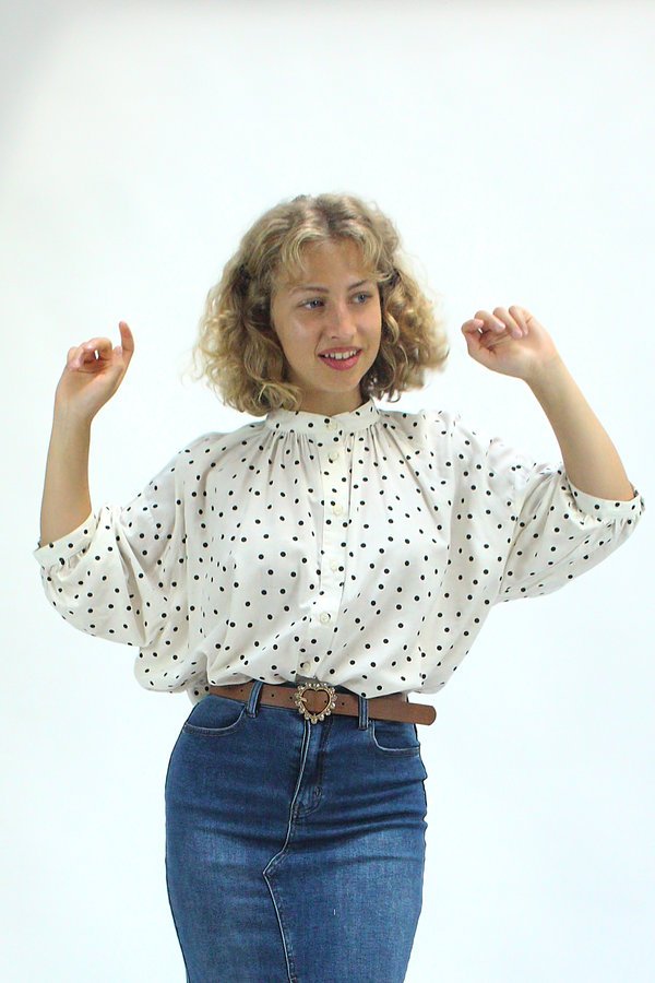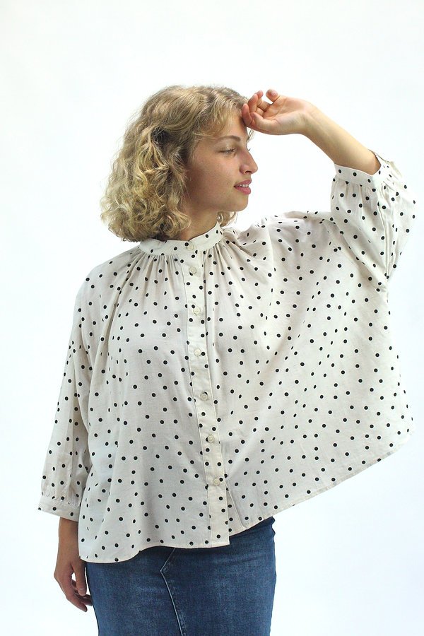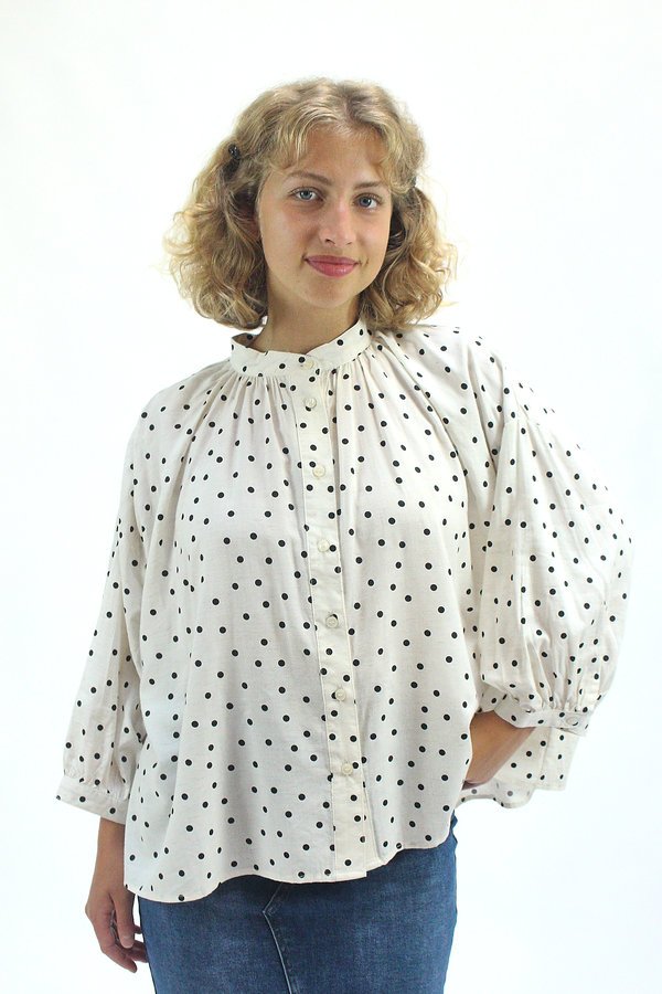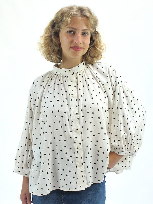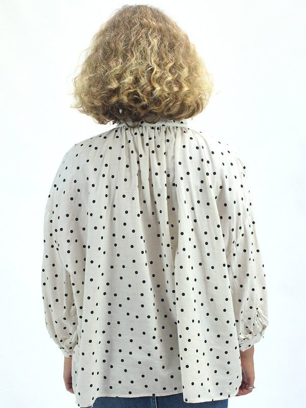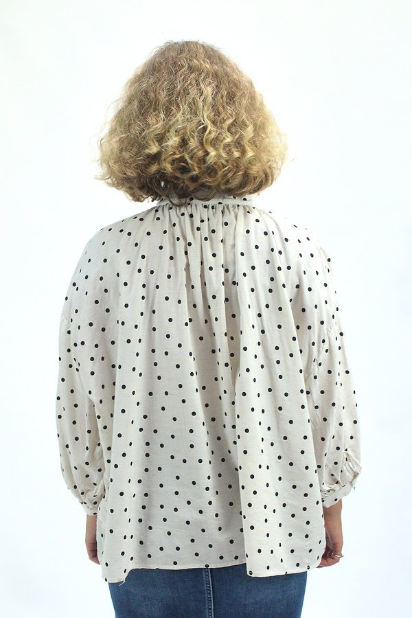 Esta camisa fluida de lunares está confeccionada en una mezcla suave de algodón y viscosa que aporta ligereza, caída y comodidad. Su diseño holgado y cuello recto con frunces genera un efecto ablusado que acompaña el movimiento con gracia. Los puños abullonados con cierre de botón y el patrón de lunares clásicos aportan un toque romántico y desenfadado. Perfecta para combinar con jeans, faldas o pantalones fluidos, es una prenda versátil para días con estilo y comodidad.