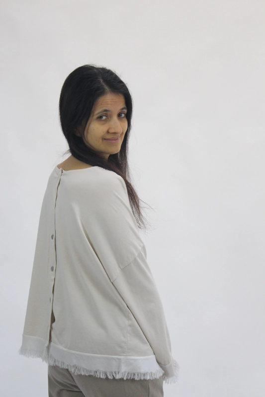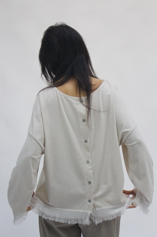 Camiseta de manga larga confeccionada en algodón suave, diseñada con un acabado especial de flecos en los bordes que aporta movimiento y un toque artesanal. En la espalda incorpora un cierre decorativo con botones que realza su estilo y añade un detalle único sin perder comodidad. Una prenda ligera, versátil y perfecta para crear looks casuales con un punto diferente.
