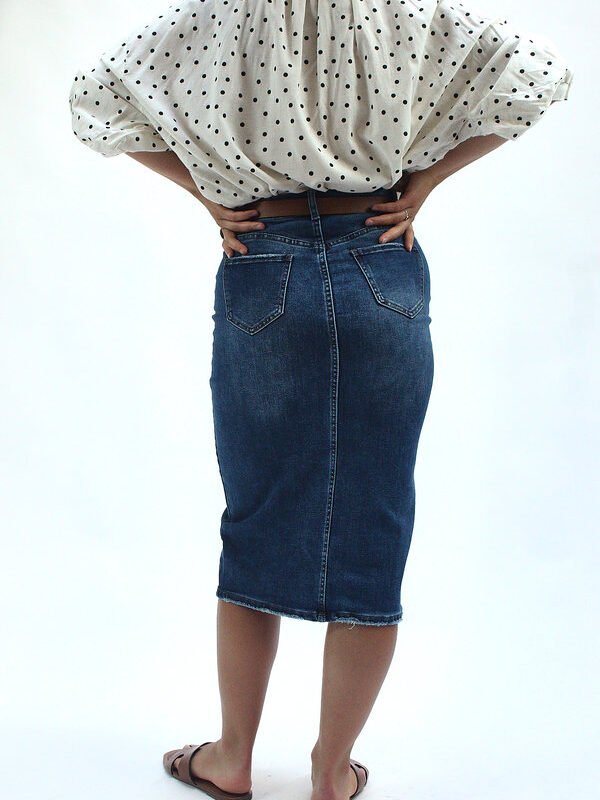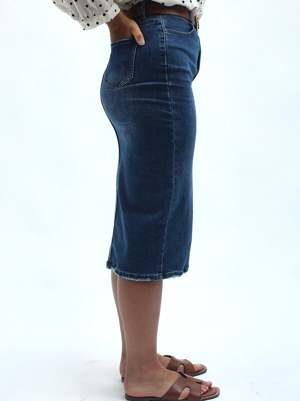Falda midi de tejido denim con abertura central, ideal para looks urbanos con un toque femenino. Confeccionada en algodón suave y ligeramente elástico, se adapta cómodamente a la silueta sin perder estructura.