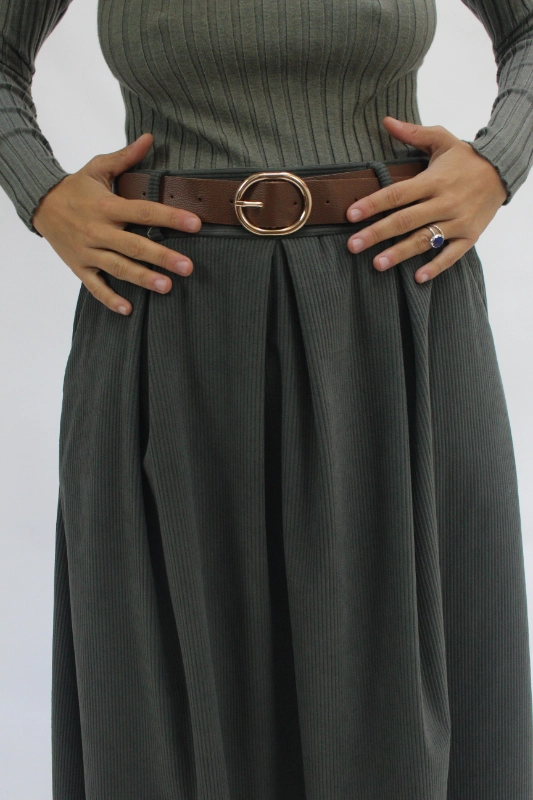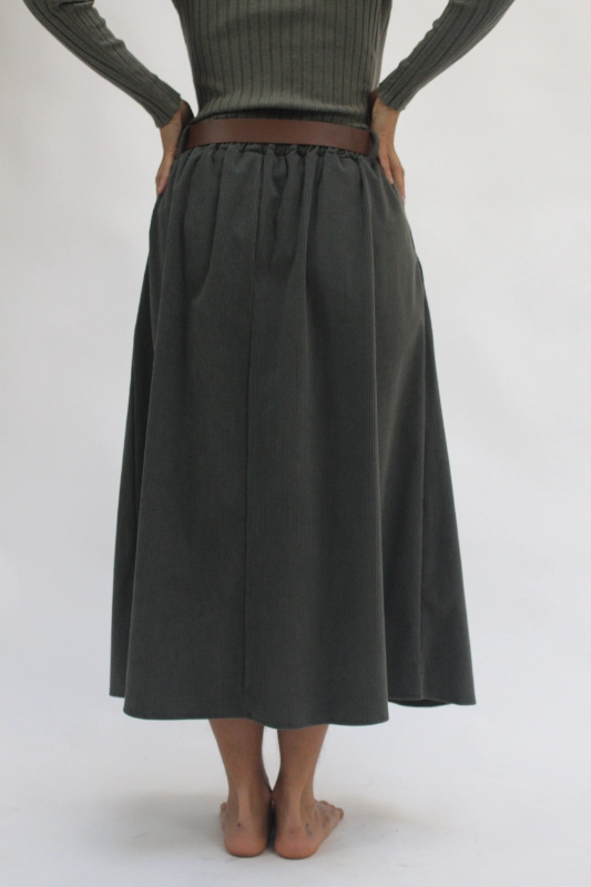 Falda confeccionada con una silueta amplia y fluida que acompaña el movimiento. Diseñada con cintura elástica para mayor comodidad e incluye un cinturón que estructura la prenda y define la figura de manera sutil.