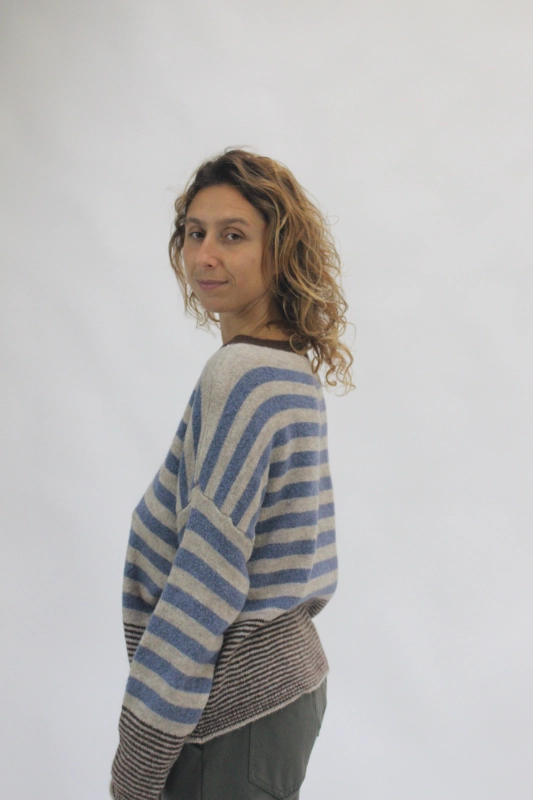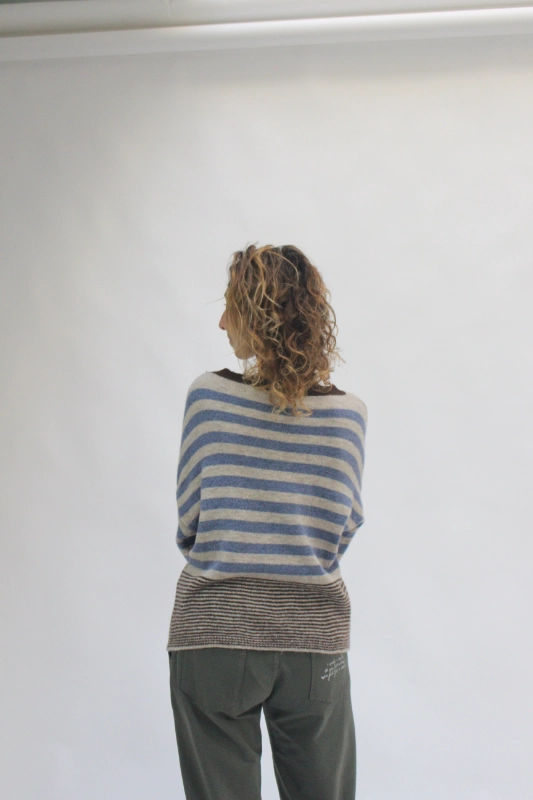 Jersey de rayas combinadas en bicolor, con un diseño que alterna franjas anchas y finas para crear una composición visual equilibrada. Su tejido suave y caída relajada lo convierten en una prenda cómoda y versátil para el día a día. El contraste del cuello y del bajo añade un toque distintivo sin perder la esencia minimalista.