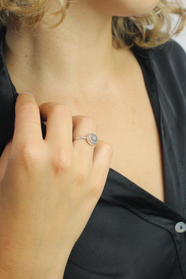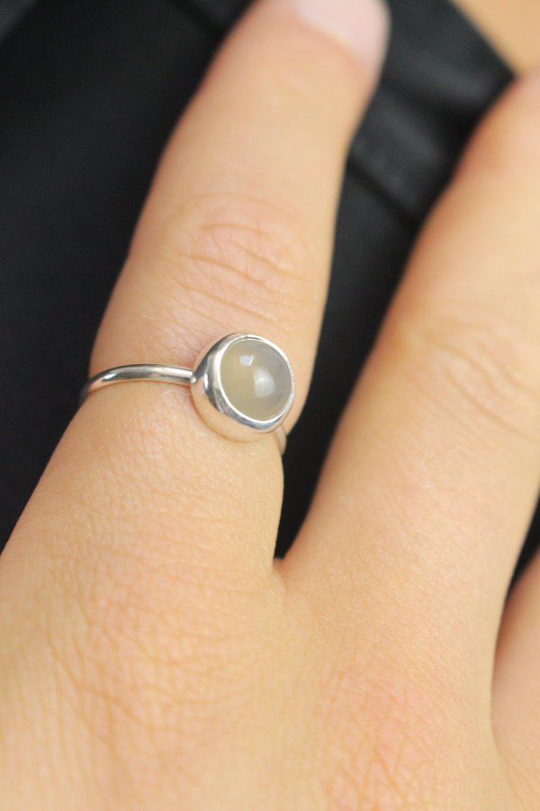 Anillo elaborado en plata 925 con piedra de luna de 8 mm montada en engaste clásico. La piedra refleja matices suaves que se potencian con la forma sólida del diseño. Hecho a mano en Tarifa. Disponible en tallas 10, 12, 14, 16 y 18. Una joya refinada y ligera con profundidad visual.