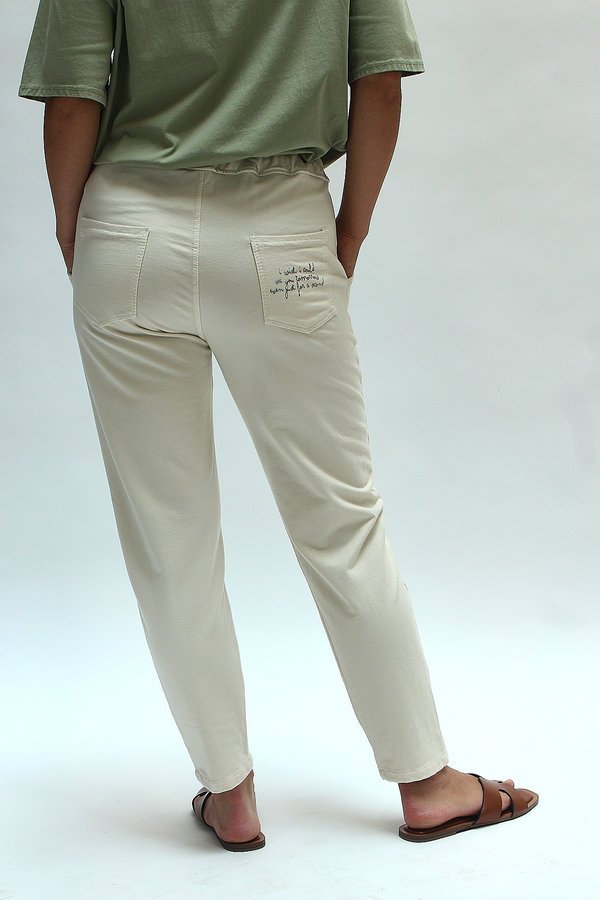 Pantalón jogger de talle único confeccionado en algodón, con cinturilla ajustable y detalle de escrita en el lateral que aporta un aire creativo y moderno. Su corte relajado y tejido suave hacen de esta prenda una opción ideal para el día a día, con personalidad y confort.