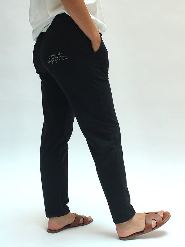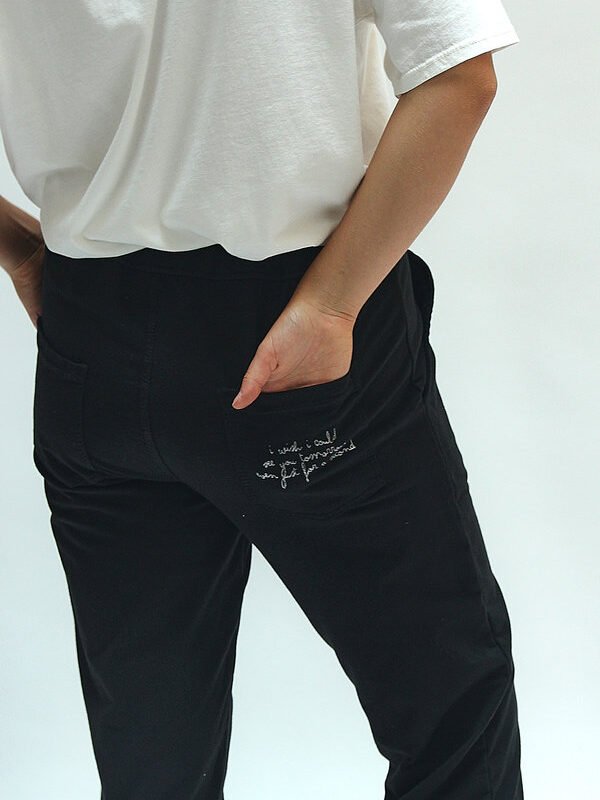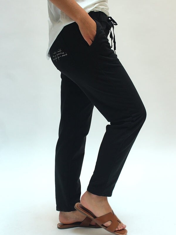 Pantalón jogger de talle único confeccionado en algodón, con cinturilla ajustable y detalle de escrita en el lateral que aporta un aire creativo y moderno. Su corte relajado y tejido suave hacen de esta prenda una opción ideal para el día a día, con personalidad y confort.