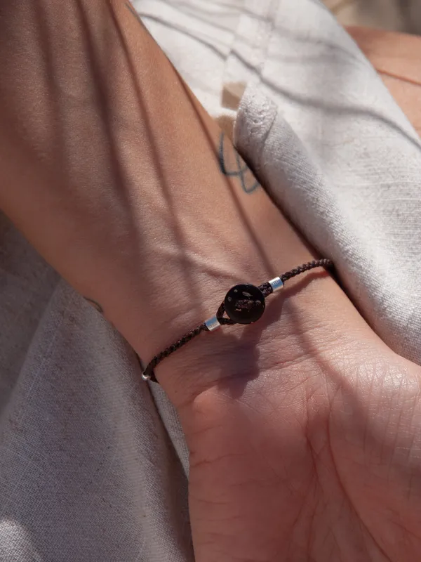 Pulsera artesanal con hilo encerado y múltiples piezas de plata 925 dispuestas a lo largo del diseño.