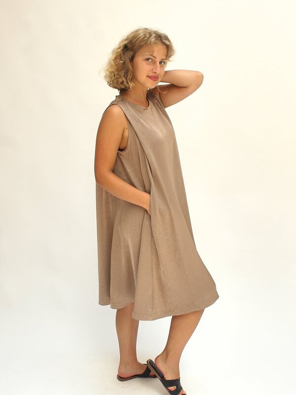 Vestido de raso de largo midi, con escote sutil y caída fluida que acompaña cada movimiento con ligereza y elegancia. De talle único, su diseño limpio abraza la silueta de forma natural, sin ajustarse demasiado, creando una imagen sofisticada y relajada a la vez.